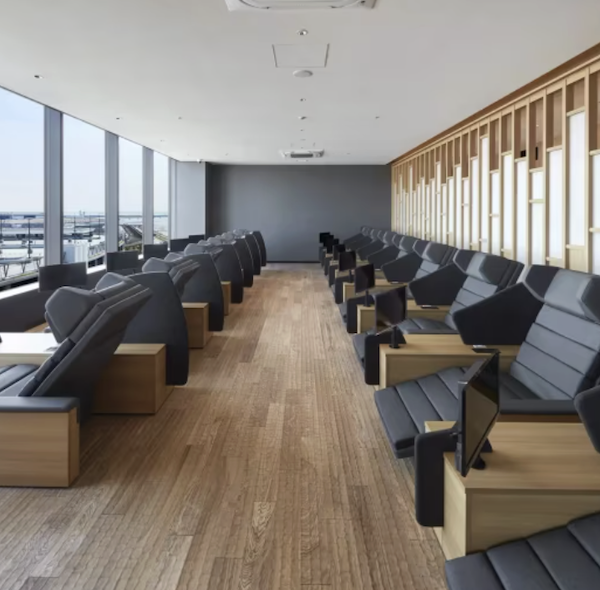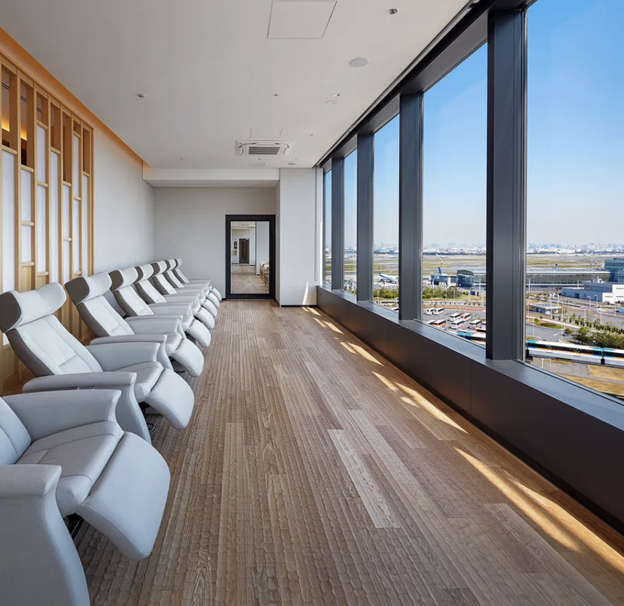 ファーストクラスのようなラウンジチェアと窓の外には空港の景色が広がります。