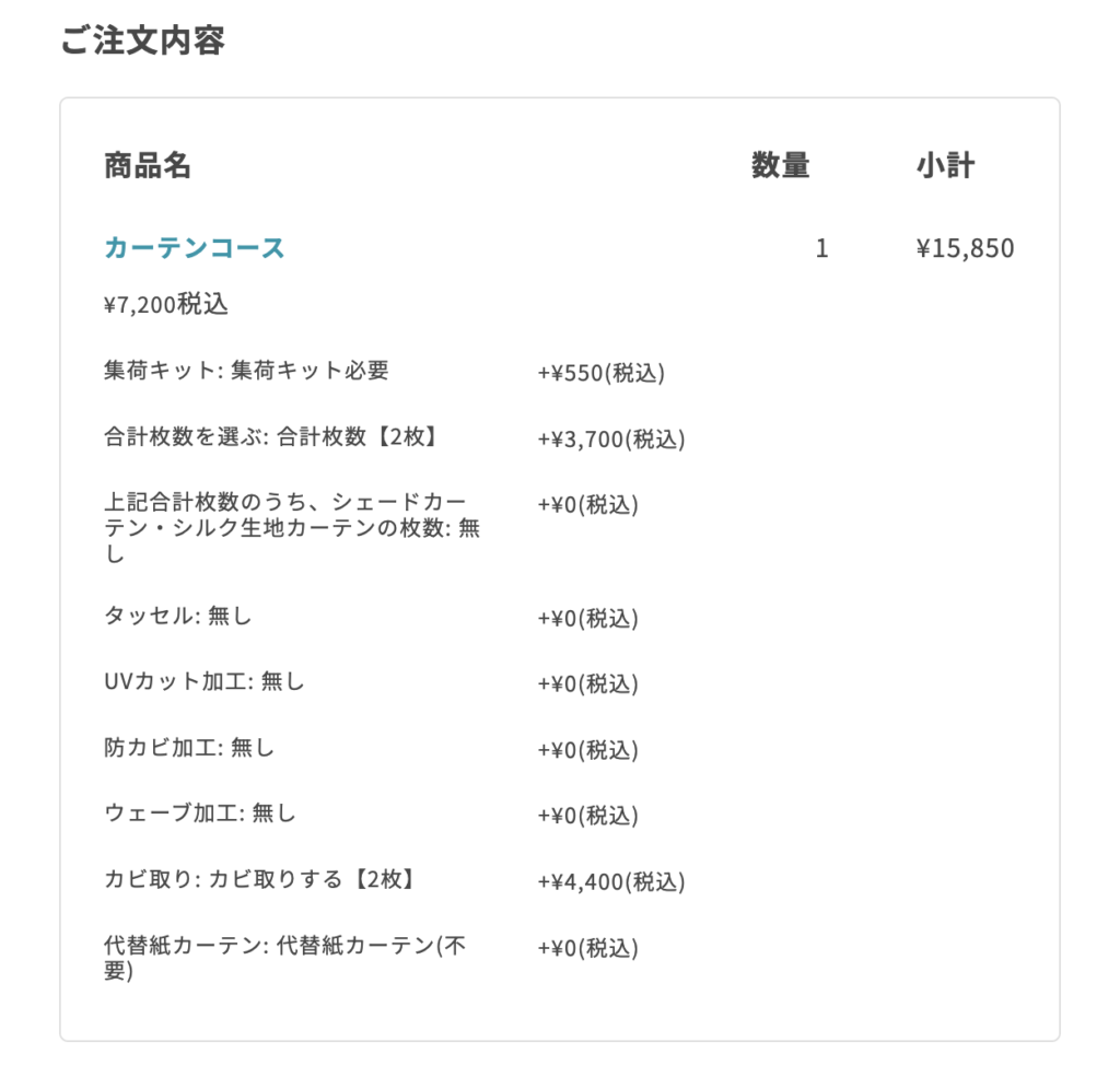 今回の注文内容はこちらです。