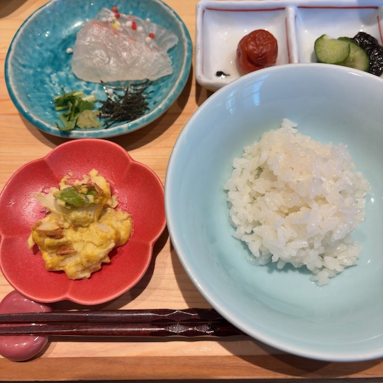 さらに真鯛の薄造り、鯛出汁、おかず豆皿3種、炎舞炊きごはん、もずくのお味噌汁と、品数も豪華な一膳です。