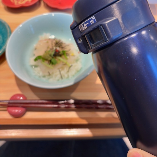 テーブルに用意された象印の卓上ポットから、温かい鯛出汁をじゅわっと注いでいただきます。こういう演出、好きです。